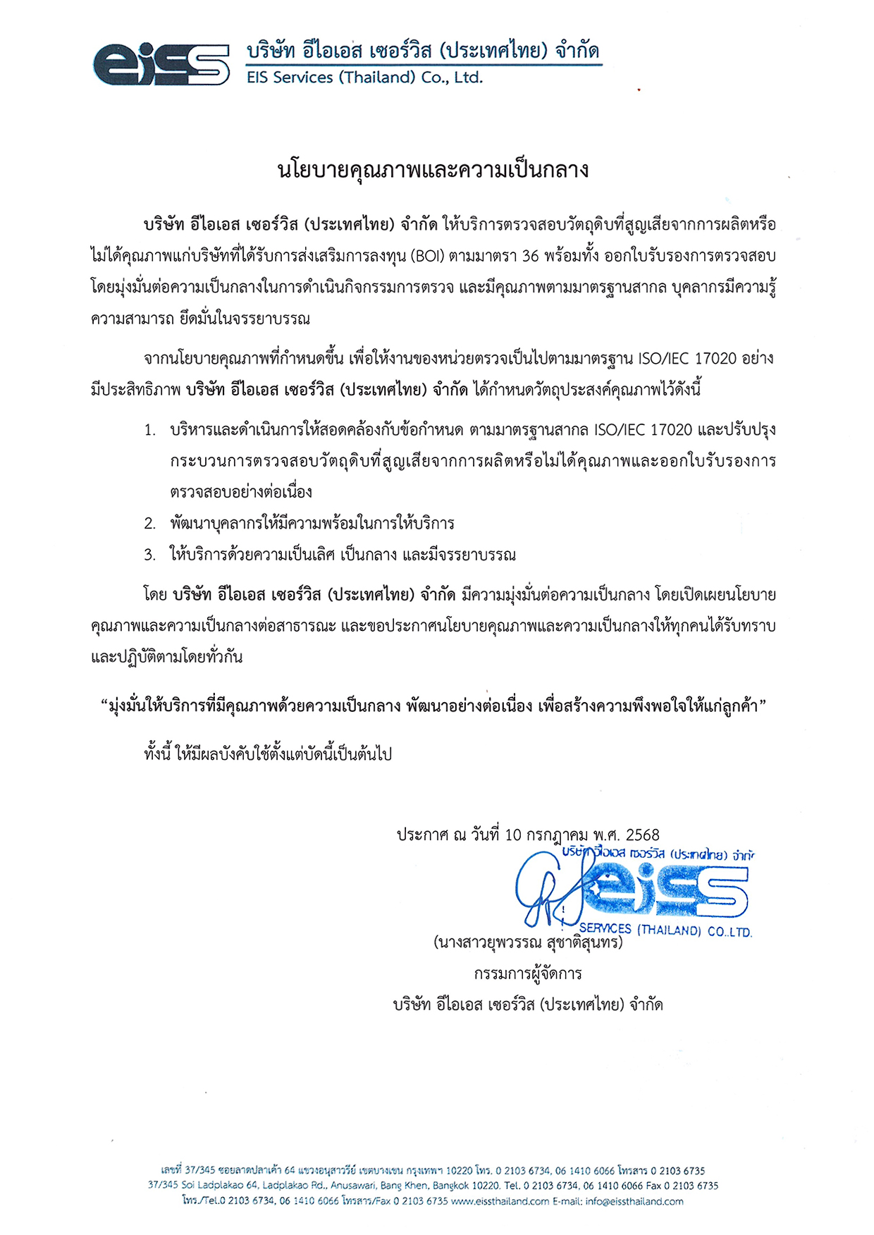 Since 2003, EIS has been accredited by the Board of Investment (BOI), refer to No. Por6/2546, to assist BOI promoted companies in inspecting the loss of raw materials in the production process or losses resulting from the use of substandard raw materials, dated May 30, 2003.